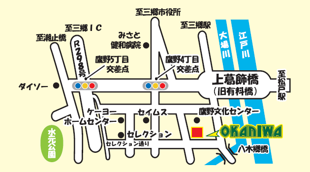 | <お車でご来店の場合> 首都高三郷6号線から三郷インター出口(東口)を降りて国道298号を松戸方面に約4km 鷹野5丁目交差点を左折 1つ目の信号(「三郷〜松戸有料道路」入口手前信号)を右折 2個目の交差点を左折して200m <公共交通機関をご利用の場合> JR常磐線金町駅下車 東部バス「三郷団地行き」または「新和1丁目行き」に乗車 ”八木郷橋”にて下車(徒歩3分) お近くまで起こしの際はご連絡下さい。お電話にて詳しくご案内致します。 有限会社岡庭自動車工業 埼玉県三郷市鷹野4-88-5 TEL:048-955-6005(代表) |